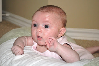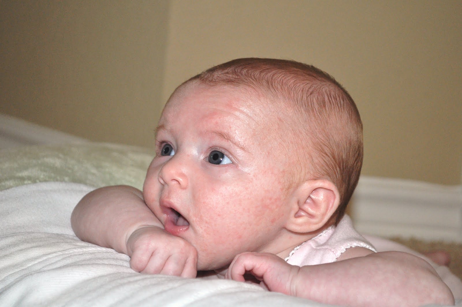 Unfortunately, she was prescribed prevacid today because her reflux is so bad (which is incidently, why she probably hated being on her back for so long and earned her the nickname “Miss Fussbuckets”). Poor thing has been refluxing pure stomach acid, and the doctor even noted some irritation in her throat. While I hate putting our healthy child on medication, we’re hoping it will be only for the short term and will help her be more comfortable. The other issue we had to address today was the rash/baby acne she has been battling for the last several weeks. We’re going to try a few different tactics, but if it doesn’t go away by the three-month mark, the doctor said it may be a milk allergy and require a change in her formula. Whatever it takes…I miss my sweet-cheeked little girl.