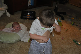 Audrey still adores her big brother, and I hope that this is just the beginning of a great relationship between the two of them. She tracks him as he moves around the room, and he definitely makes her smile with his “where’s Audrey?” routine. He is a great big brother, and he can calm her down just by taking her little hand in his. So cute. I can only imagine what she’s thinking when she sees him running around like a little tornado (like here, where he’s dumped an entire 64-count box of crayons out and is coloring on the items in his doctor kit). If she has half his energy when she’s mobile, I will be in serious trouble! Can you see Keegan’s forehead in this picture? Yeah, it is covered in a giant bruise and is twice it’s normal size because he tripped and ran smack into the corner edge of a dresser at my parents’ house…while airborne! Seriously, can you imagine having two of them running around causing trouble?! I have nightmares about it already.