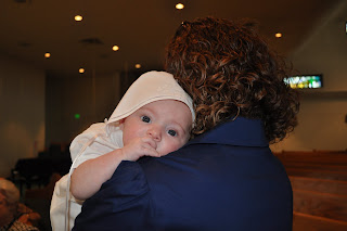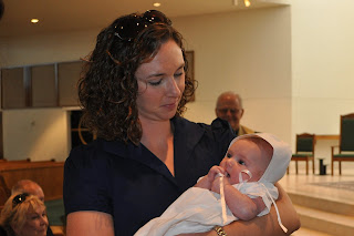 We were blessed to have Father Postell baptize Audrey yesterday morning. Audrey was a complete angel during the ceremony and reception afterward. She certainly seems to be feeling better and adapting to a schedule, which has made her little personality just blossom.