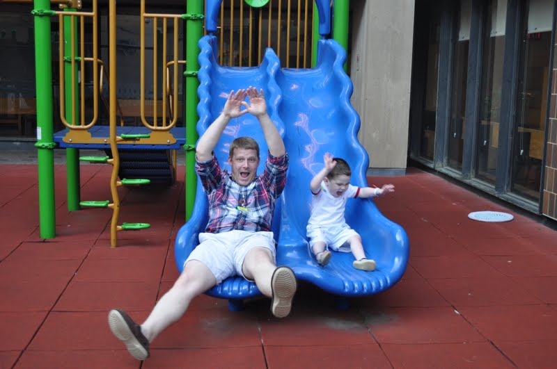 There is a small playground at the hospital. Friday afternoon when we finally convinced him to get out of bed, we showed him the playground. Keegan probably hasn’t been to one (except for his little fort in the backyard) since at least January. He went down the slide a few times and walked around, but he was fresh off his last fever and not feeling quite right yet. So, we went back yesterday afternoon and did a little better.