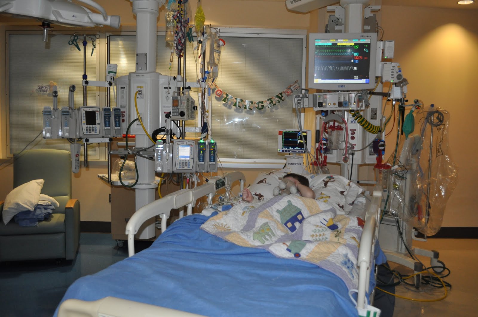 Just a quick note to say the surgery went well, much smoother than anyone was really expecting, I think. Keegan is doing well too. I am pretty confident that he will go back to the cardiac floor tomorrow afternoon after his femoral and arterial lines are removed. The best news is that we don’t think that he suffered any neurological complications so far from the line coming out. He has had a few energy spurts of sitting up in bed. He recognized all of our family members, asked for Curious George, and counted to 5, and colored for a bit. I definitely think that he feels better than he has the last few days.