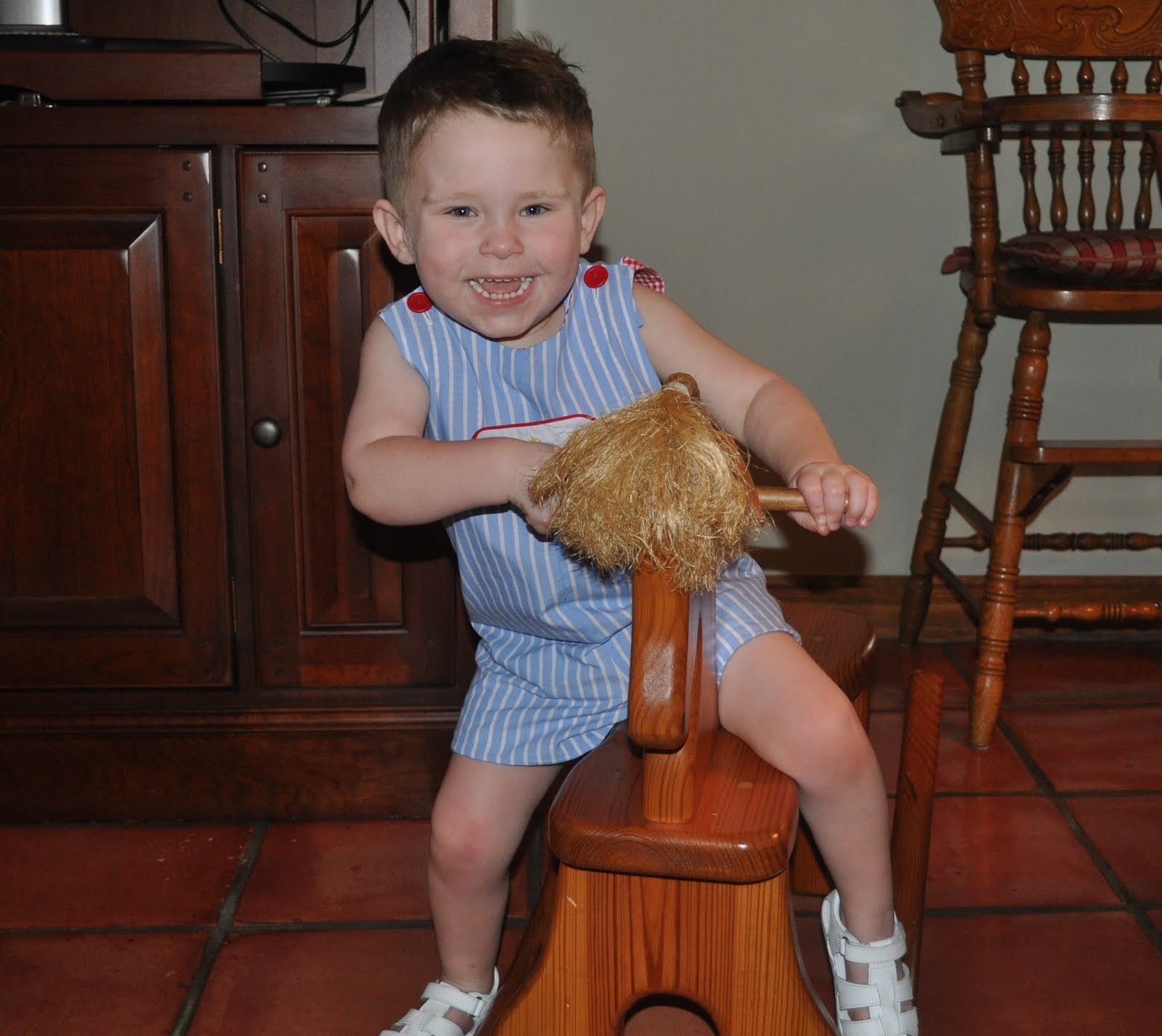 Saying “yeehaw” on the rocking horse Poppy made 30 years ago for Mama…