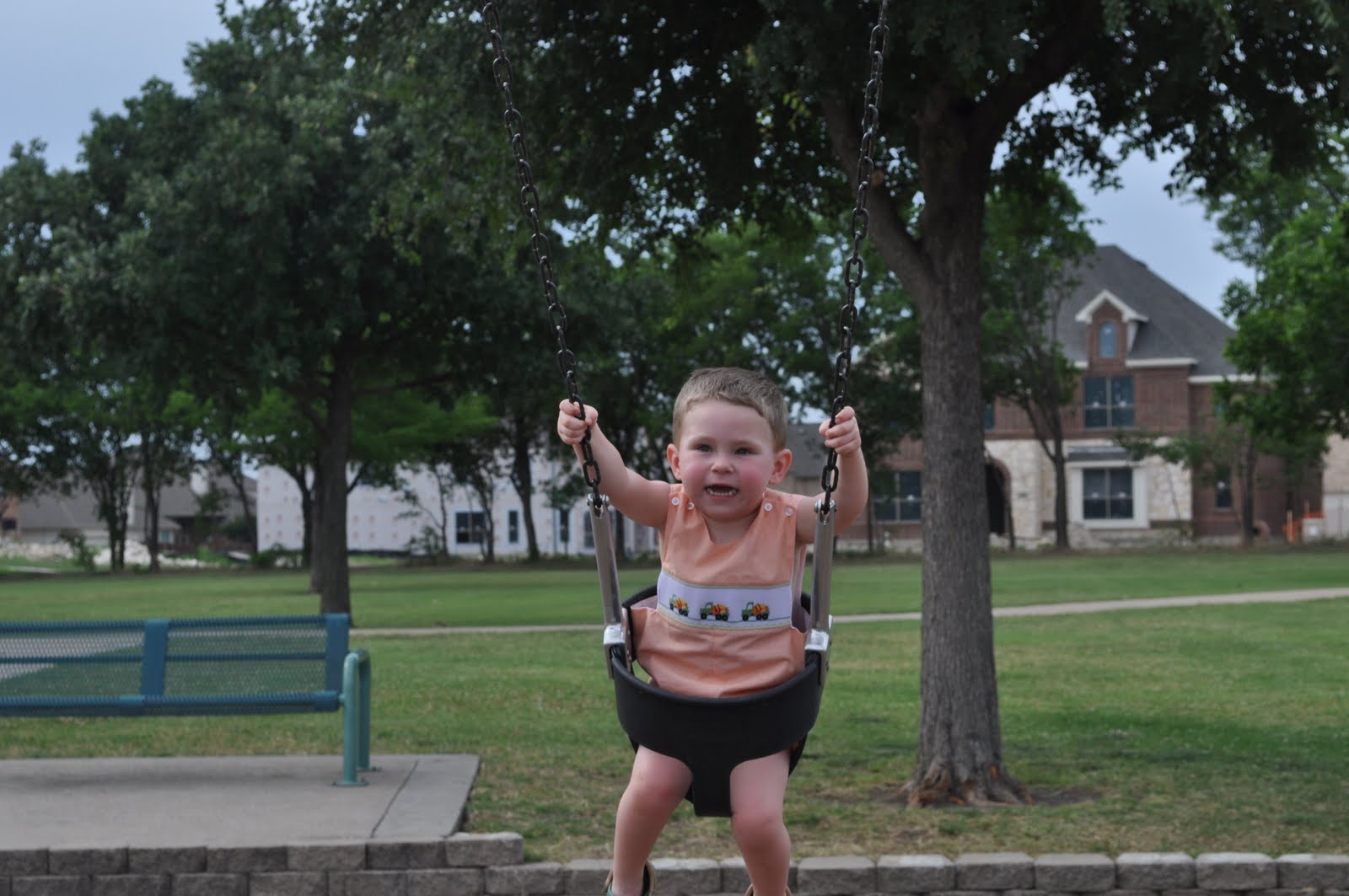 A rare picture of Keegan swinging! Somehow, Mamie convinced him to get in the swing. He never wants to stop to swing!