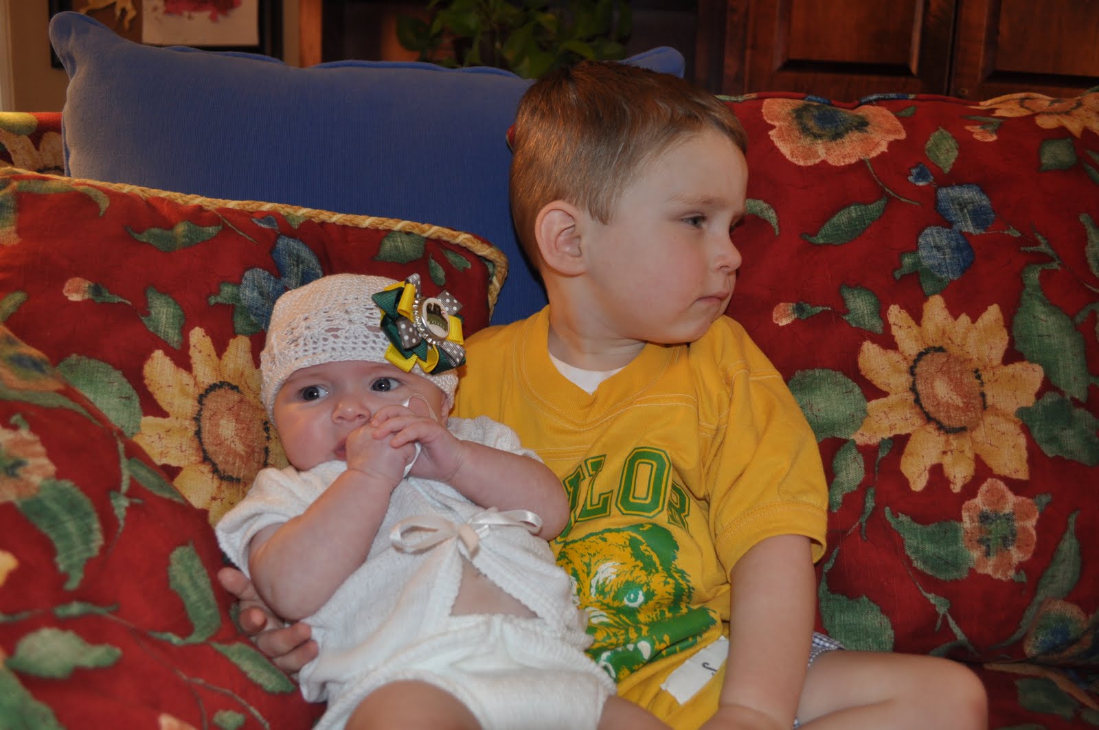 We had some fun in our Baylor gear before the Bears went 2-0 last weekend against Buffalo!  I wish I could hold out similar hope for this weekend, but we’re playing TCU at TCU…yeah, not so much.  It was good while it lasted!  Love Audrey’s bow?  Visit my friend Stephanie’s store at http://www.patiecakes.com/ or http://www.etsy.com/shop/patiecakes.  She makes the cutest stuff and almost all of A’s bows.  The sports bows are great, and she does them for college & pro too!  And Keegan’s shirt is actually Gray’s from when he was a boy at Baylor camp in the summer.  The back says “Gray 2002″…I think it’s actually an old Baylor Line jersey from the 80s.