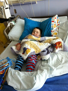 We know that it is necessary to treat the current crisis first before we can deal with the long-term issues. So, we are trying to focus on that. The current discharge plan is that we can go home once he has been fever-free for 48 hours (beginning this morning), ferritin trending down for 48 hours (not yet), and stable (fluid/kidneys/blood pressure) on the higher steroid doses. Looks like earliest discharge would be Thursday sometime. Outwardly, he continues to not look too bad. Very little desire to get out of bed, minimal desire to play, and very little endurance when we have asked him to walk a bit. But in a better mood today with less agitation. With the fever gone, he has been retching less and actually kept down a few bites of food (not without putting up a good fight to keep it down, bless his little heart). It’s mind-blowing to look at how calm he is on the surface, knowing the storm that is raging underneath.