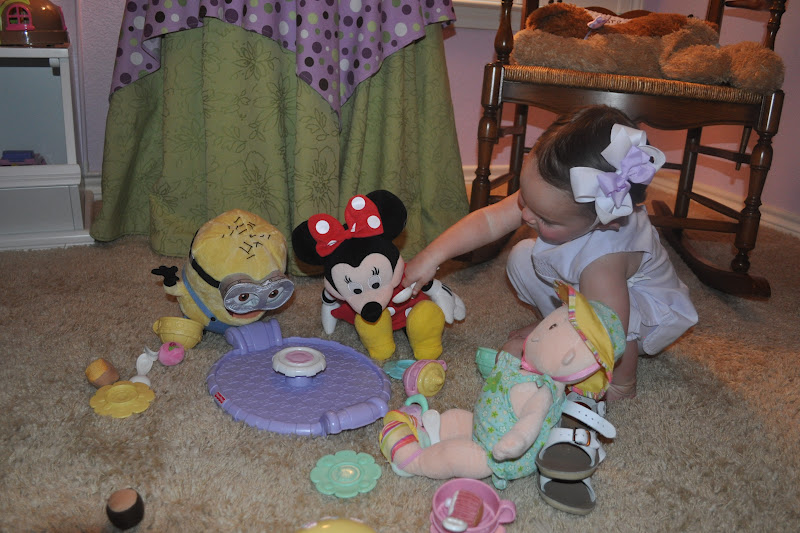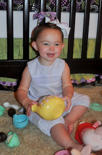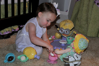 The first two guests to arrive were a mignon (from the movie Despicable Me, of course) and Baby Stella. And yes, her shoes are holding Baby Stella up. This was a big ordeal until Mama found a way to prop her up. Not old enough to sit on her own but old enough for tea, evidently!