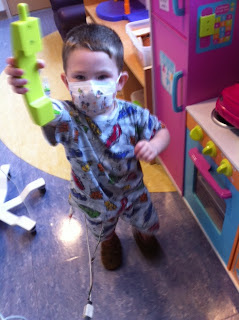 Other than a very early nap, Keegan seemed to do pretty well today. They took him off of isolation. He went to the playroom for about 20-30 minutes in the early afternoon, which just about wiped him completely out for the rest of the day. You could tell he wanted to play but was struggling. His heartrate was in the high 160s/170 while he was walking around. Whew! Maybe a little much for the first day out of bed, but he it was worth it to see him have some fun.