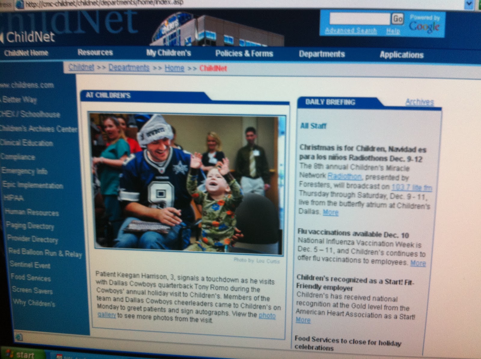 Keegan’s visit with Tony Romo was front page news on the internal Daily Briefing for staff today.
