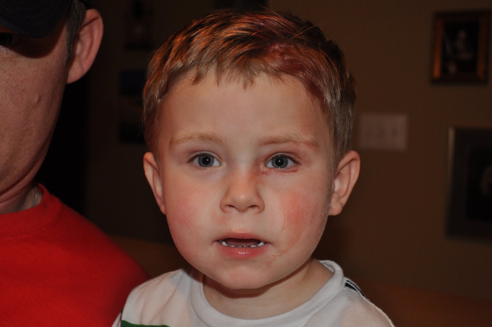 I quickly wanted to put an update about the end of our Mother’s Day weekend. I had been feeling “off” all weekend and started having contractions with increasing frequency Sunday night. Right around the time we decided to call my OB, Keegan ran into the corner of the office desk while playing. He didn’t even blink an eye at the time, but a few minutes later, Gray looked up to see Keegan bleeding profusely from a tiny little break on his scalp. We were able to stop the bleeding after a few minutes. It just must have hit at the right angle, and he’s absolutely fine. We didn’t get a picture of the full horror movie look, but here’s some photographic proof of his first “gusher”.